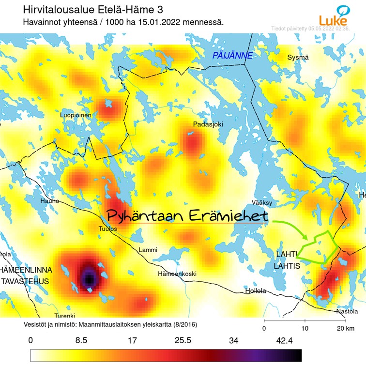 Isoimmista riistaeläimistä Suomen luonnonvarakeskus ylläpitää laajaa tietorekisteriä sivulla https://luonnonvaratieto.luke.fi/kartat?panel=hirvi-ja-sorkkaelaimet. Kartan tiedot perustuvat metsästäjien tekemiin lakisääteisiin ilmoituksiin. Pyhäntaan Erämiesten metsästysalue kuuluu Etelä-Häme 3 hirvitalousalueeseen [EH3], joka ulottuu Pyhäntaalta Padasjoelle ja Hauholle. Rekisteri perustuu pääosin metsästäjien tekemiin havaintoihin ja niiden kirjaamiseen Oma Riista – seurantajärjestelmään.
